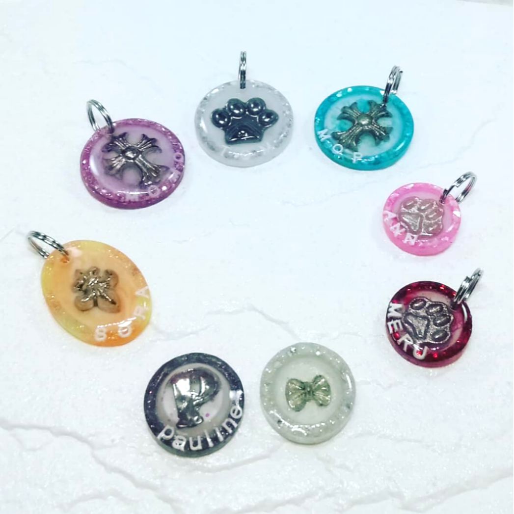 銀色のアルファベットを埋め込んだ個性的でお洒落なデザインの迷子札です。