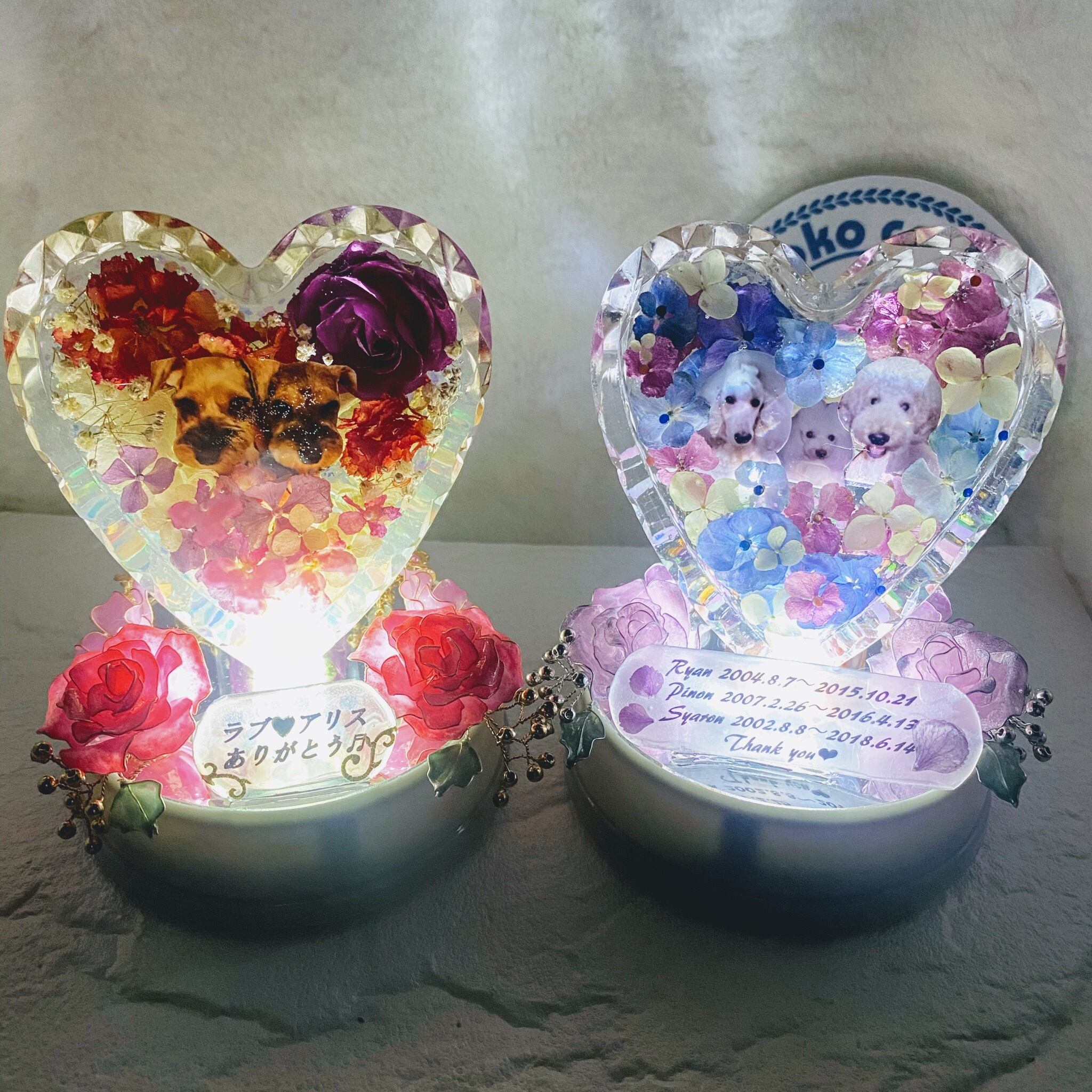 ハートの中に愛するペットとドライフラワーをレジンで封じ込め、周りをドライフラワーにはない独特な色合いのワイヤーフラワーで飾り付けしたオブジェです。